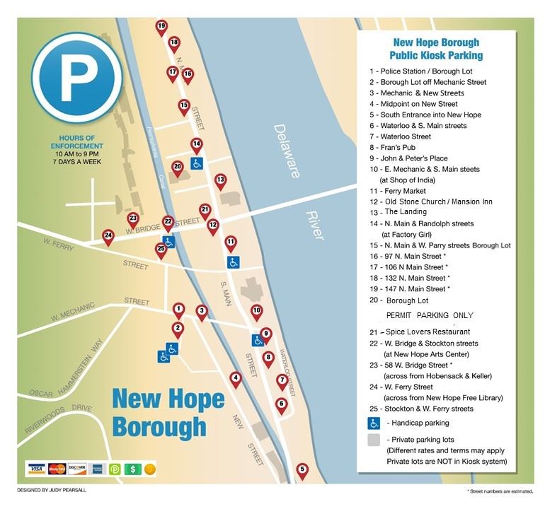 Parking has never been easier in New Hope Borough.  Our new kiosk system takes quarters, bills, credit cards, and parking apps ParkMobile.  Just know your license plate number and PAY BY PLATE.  No need to display a receipt on your dashboard.